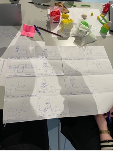 Til at starte med havde vi en ide om at benytte os af royalty free billeder, som baggrunde til vores scener, men vi valgte dog selv at tegne dem grundet æstetiske årsager.Billederne viser processen hvor vi skrev ideer ned og tegnede et storyboard. Derefter formede vi vores figurer, så at vi kunne begynde at filme.