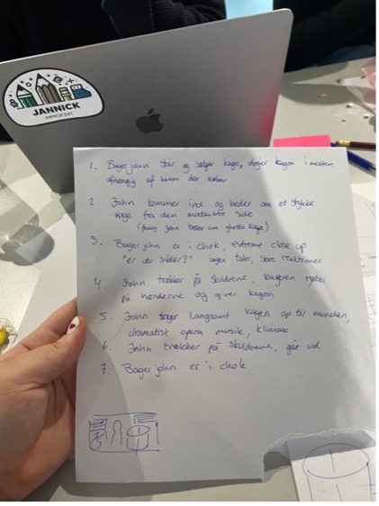 Først skrev vi ned præcis hvad der skulle ske og evntuelle noter (fx hvis vinklen skulle være specielt mm.)Vi lavede storyboard med beskrivelse for at visualisere vores plan.