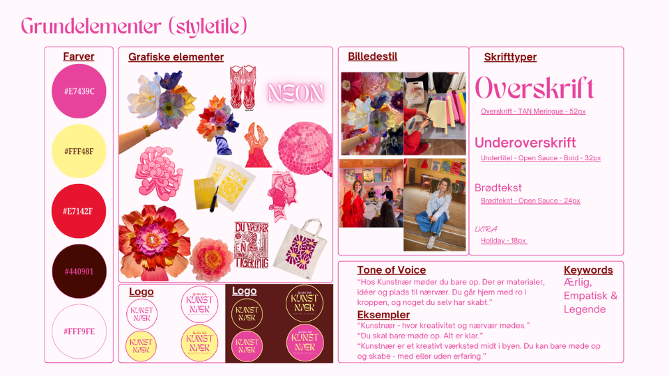 I den visuelle del arbejdede vi med at skabe en tydelig og genkendelig identitet for Kunstnær, som både kunne afspejle stemningen i værkstedet og tale til den ønskede målgruppe. Vi udviklede et styletile, der tog udgangspunkt i farverne rød, gul og pink – farver som allerede fandtes i Kunstnærs nuværende udtryk, men som vi satte i system og brugte aktivt på tværs af kampagnens produkter. Vi valgte runde former og håndskrevne elementer for at fremhæve det legende, tilgængelige og kreative udtryk, som Louise ønskede at bevare.