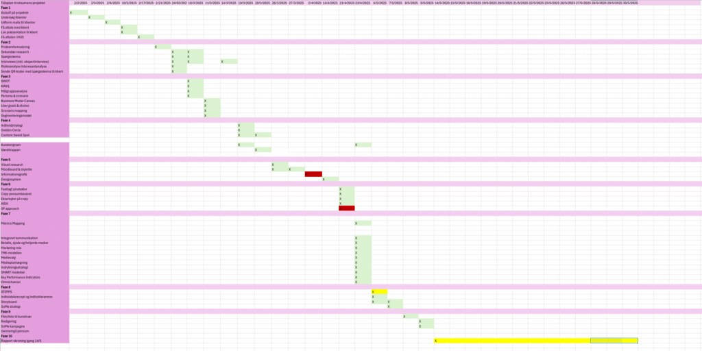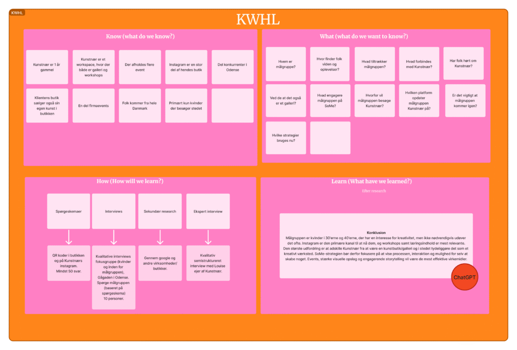 Vi startede projektet med at lære Kunstnær og Louise at kende, både hendes vision og de praktiske rammer for stedet. Indledningsvist arbejdede vi med at forstå problemet og kortlægge behov og potentialer gennem brainstorming og et KWHL-skema. Det hjalp os med at definere en foreløbig retning, som vi efterfølgende tilpassede på baggrund af vores research. Vi gjorde brug at Excel som projektstyrring og har ærligt erkendt undervejs i projektet at vi havde svært ved det. vi prøvede flere projektstryringsmetoder som scrum og waterfall men erfarede til sidst at vi nok bare har gjort brug af kanban.