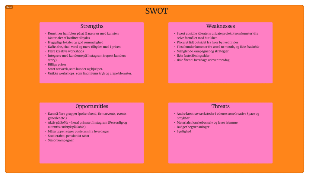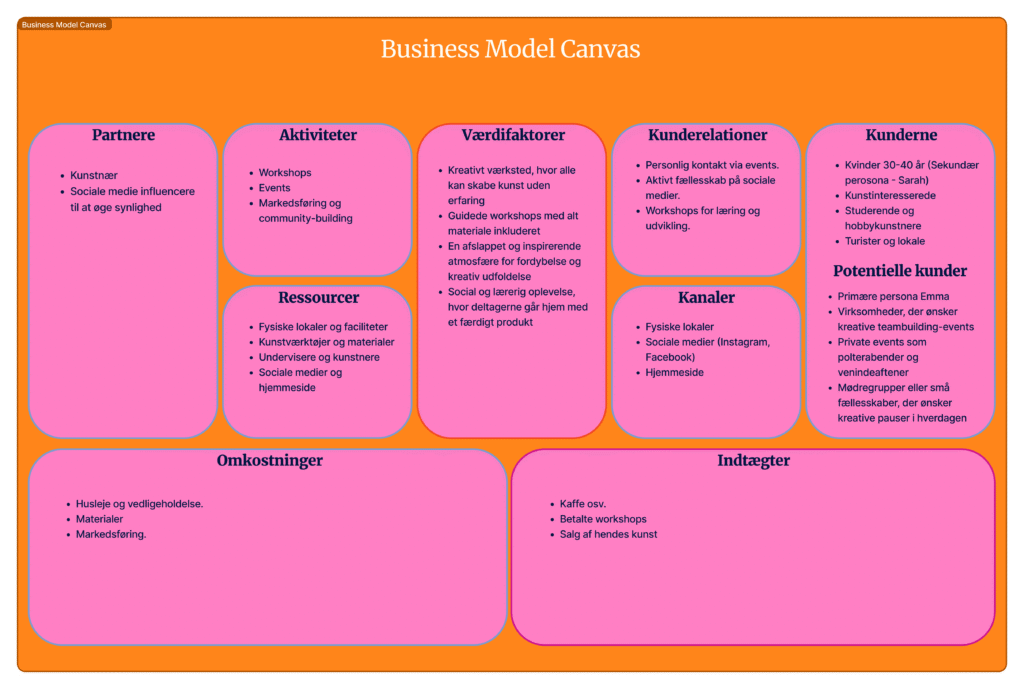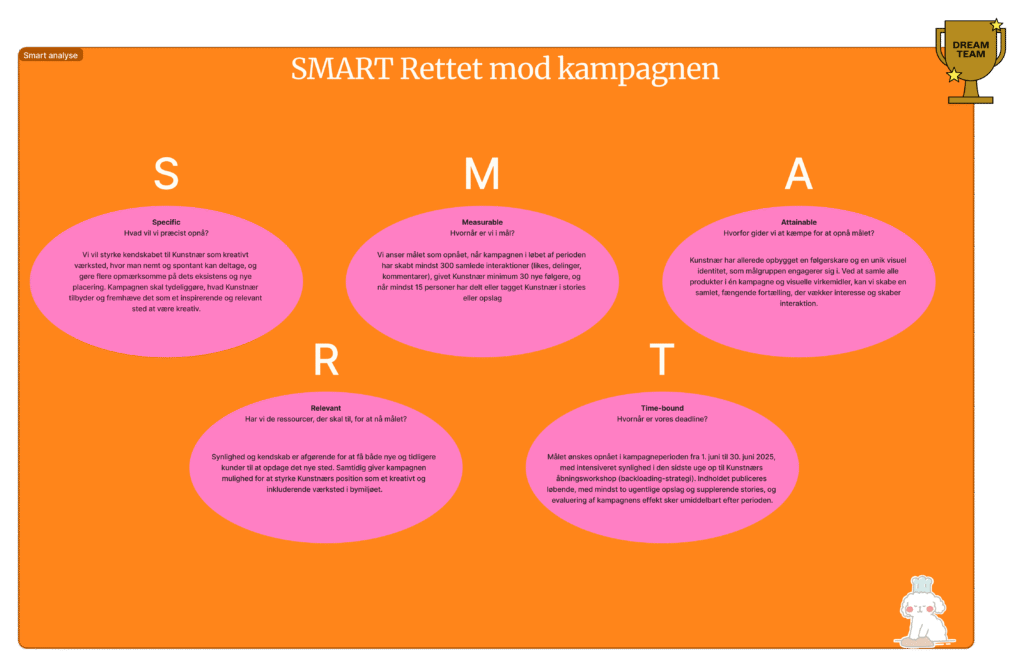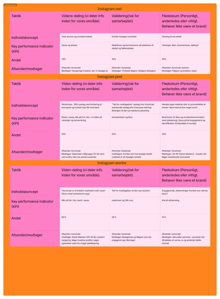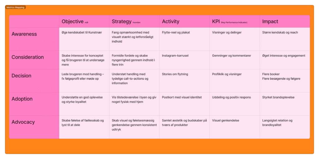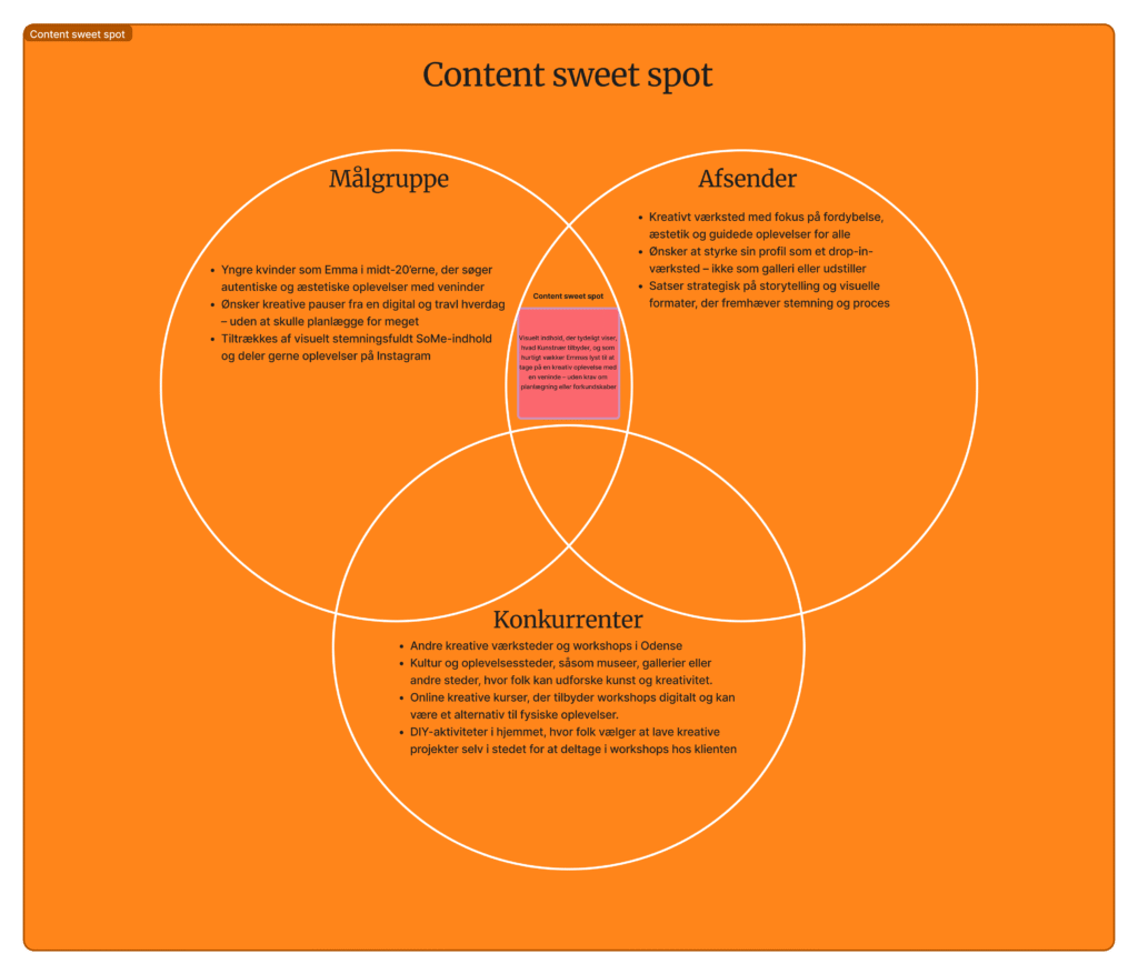 I den strategiske fase arbejdede vi med Business Model Canvas, Value Proposition Canvas og Content Sweet Spot for at finde ind til, hvad Kunstnær tilbyder, hvordan det er unikt, og hvordan vi bedst kunne kommunikere det. Vi brugte SMART-modellen til at opstille konkrete og realistiske målsætninger for kampagnen.