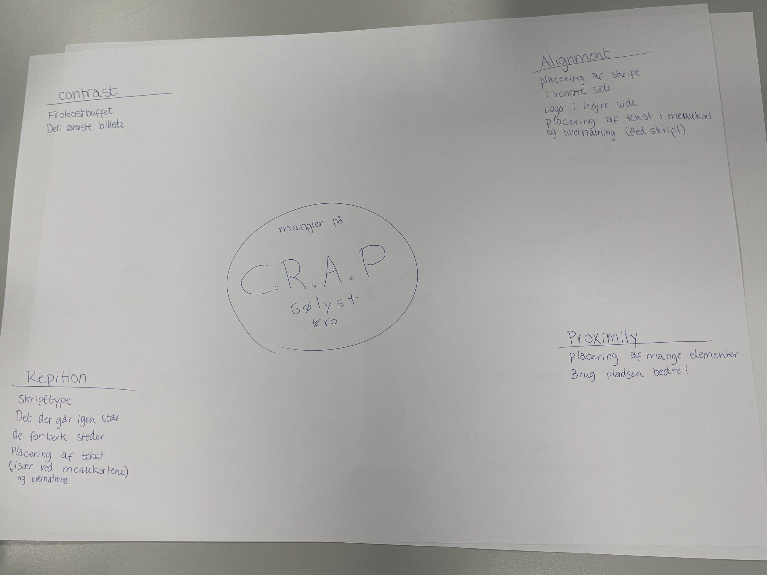 Vi lavede hurtigt en plan over de kommende dage og aftale hvor og hvornår vi mødtes. Alle var enige om kun at arbejde fysisk, og ikke onlin. De første par dage gik med at finde frem til vores hjemmeside, tale om designprincipperne C.R.A.P og kigge på konkurrenter til vores valgte hjemmeside. Vi skrev ned på et papir hvilke mangler vi lagde mærke til i forhold til C.R.AP. Vi lavede også et mindmap over det potentiale af ændringer på vores valgte hjemmeside som kan ses her: