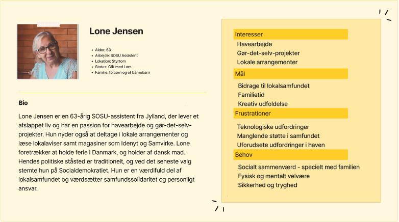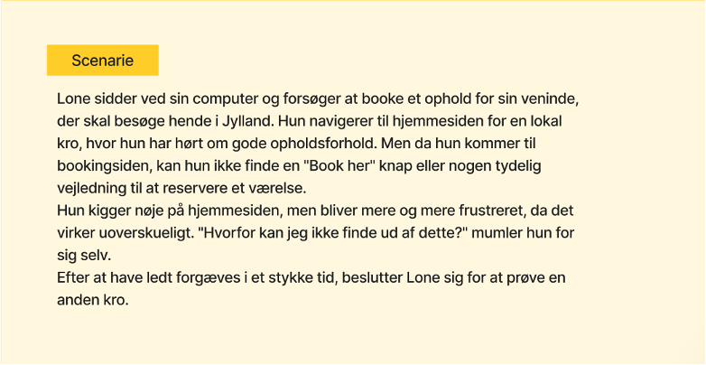 Ud fra vores erfaringer med brugertesten lavede vi to personaer som hver især oplevede et problematisk scenarie med hjemmesiden. Det hjalp os på vej hen til det vi ønskede at optimere på hjemmeside.