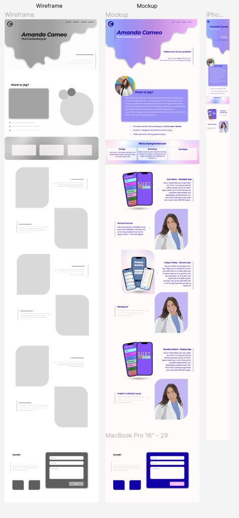 Dernæst var det “bare” at gå i sving med mockup. Jeg lavede om i min wireframe op til flere gange fordi jeg ikke kunne få det til at se pænt ud i mobil versionen. Det var vigtigt at mobil versionen så flot ud, da min præsentationsportfolio skal være responsiv, og derfor se flot ud uanset hvilken skærmstørrelse.