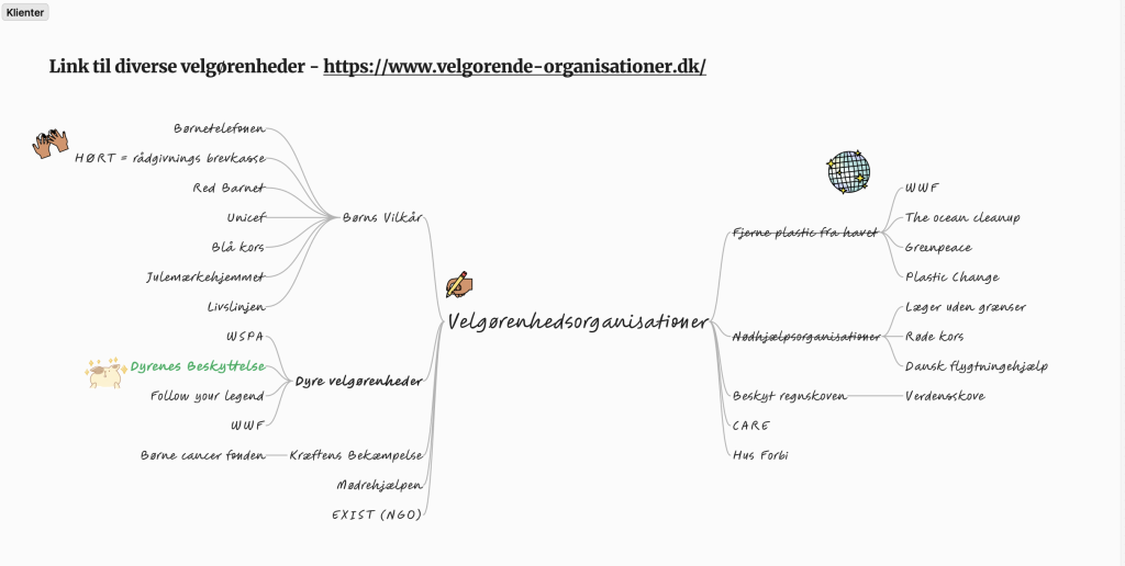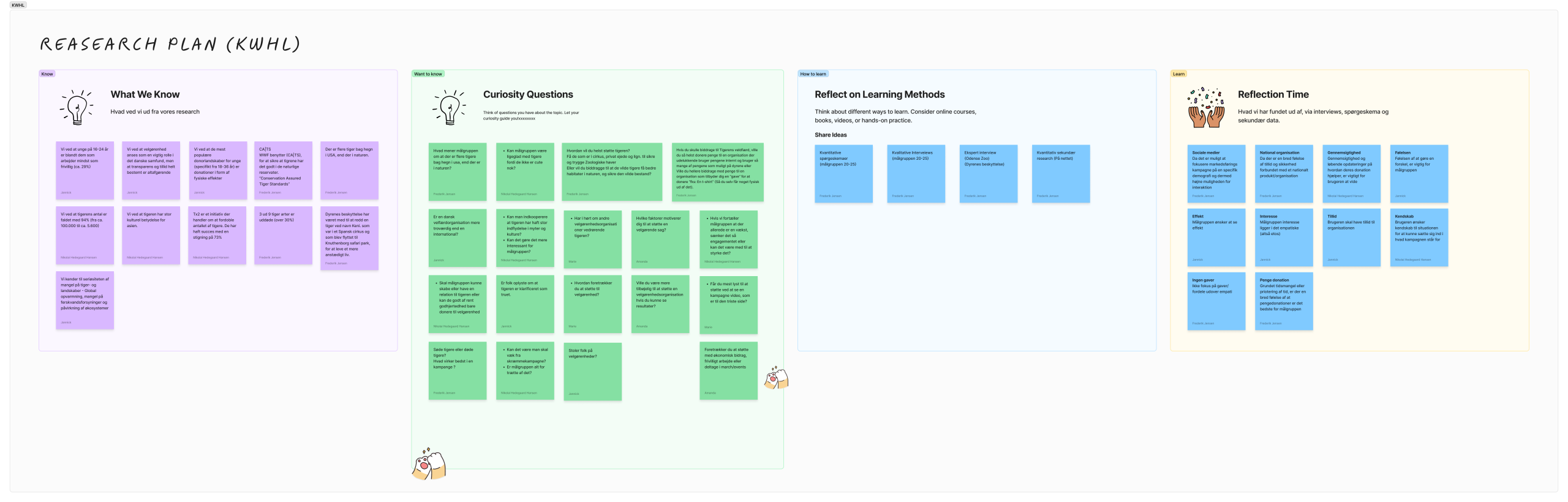 Vi startede med at oprette en gruppekontrakt, hvor vi definerede roller og forventninger til hinanden i samarbejdet. Gruppens første fælles opgave var en brainstorm om, hvilken velgørenhedsorganisation vi ville fokusere på. Her kom vi hurtigt frem til, at Dyrenes Beskyttelse og specifikt deres arbejde for truede arter ville være relevant. Derfor besluttede vi at skabe en kampagne med tigeren som omdrejningspunkt og målrettede projektet mod at oplyse og engagere unge i denne sag.