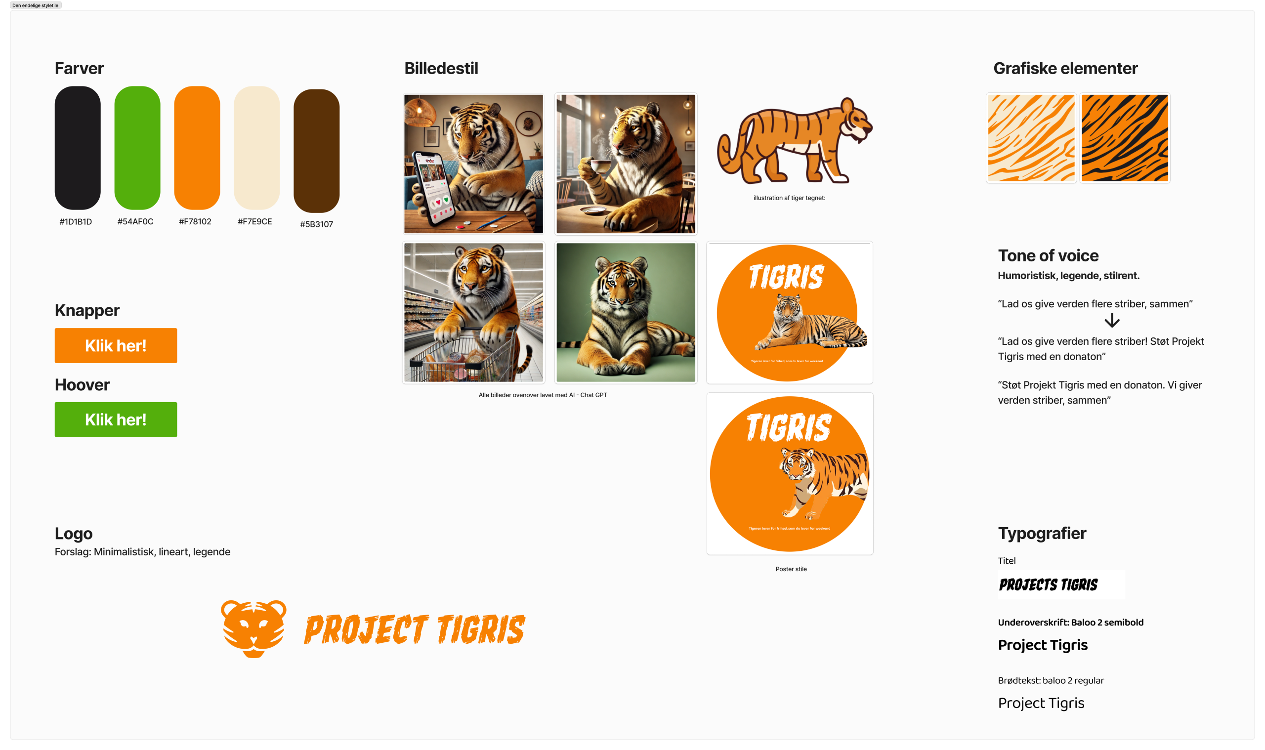 I takt med at vi afslutter de sidste faser, er vi i gang med at skabe et digitalt produkt, der formidler tigerens situation og engagerer brugerne på en meningsfuld måde. Resultatet forventes at være en brugervenlig hjemmeside og en kampagne på sociale medier, der både oplyser og motiverer målgruppen til at støtte tigerens bevarelse. Med en stærk visuel identitet og målrettet SoMe-indhold har vi sigtet mod at skabe en helhedsoplevelse, der er engagerende og informativ.